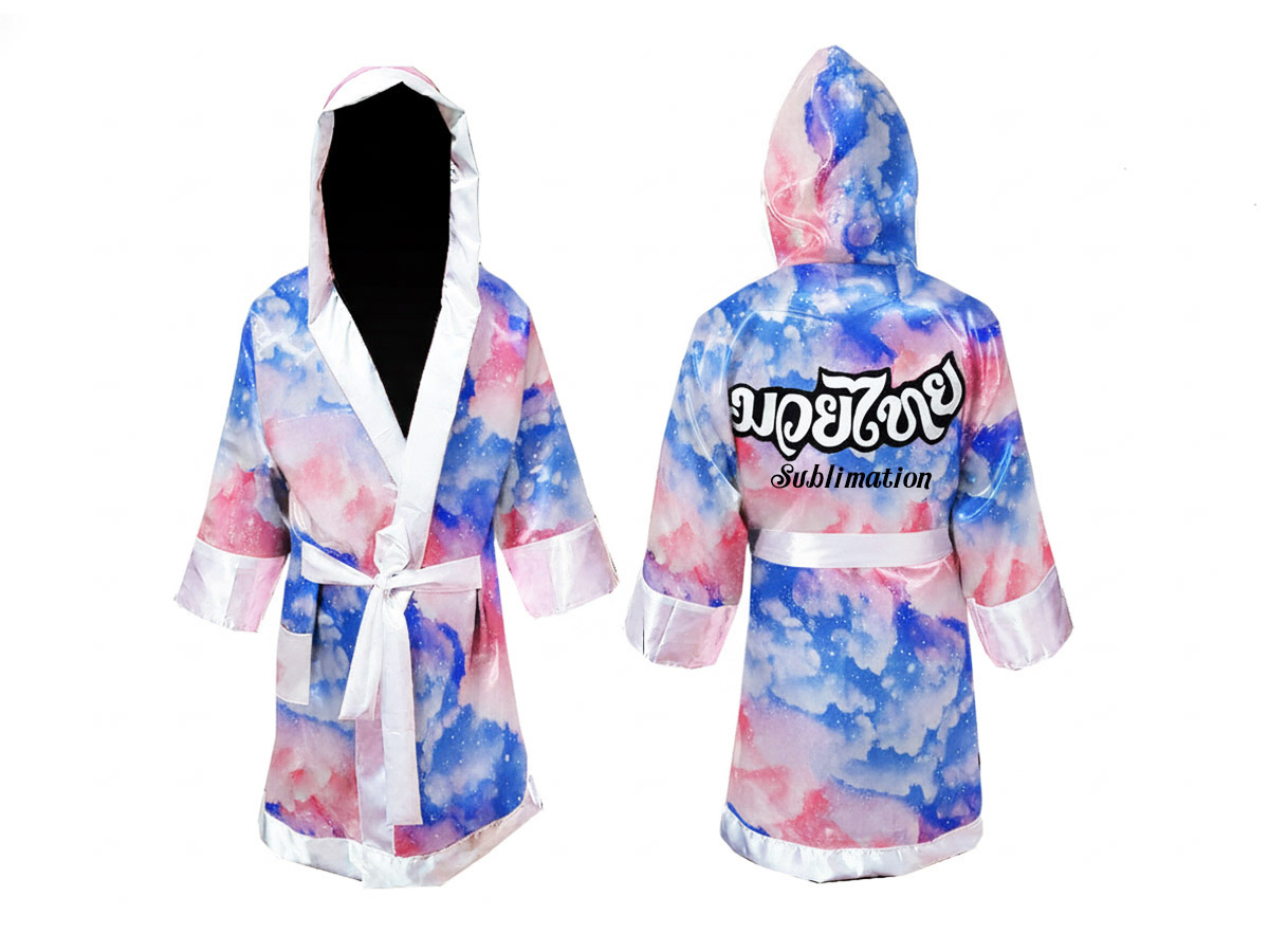 Personalisierter Boxmantel mit Sublimationsdruck. Bedruckter Boxmantel für Muay-Thai-Kämpfer.